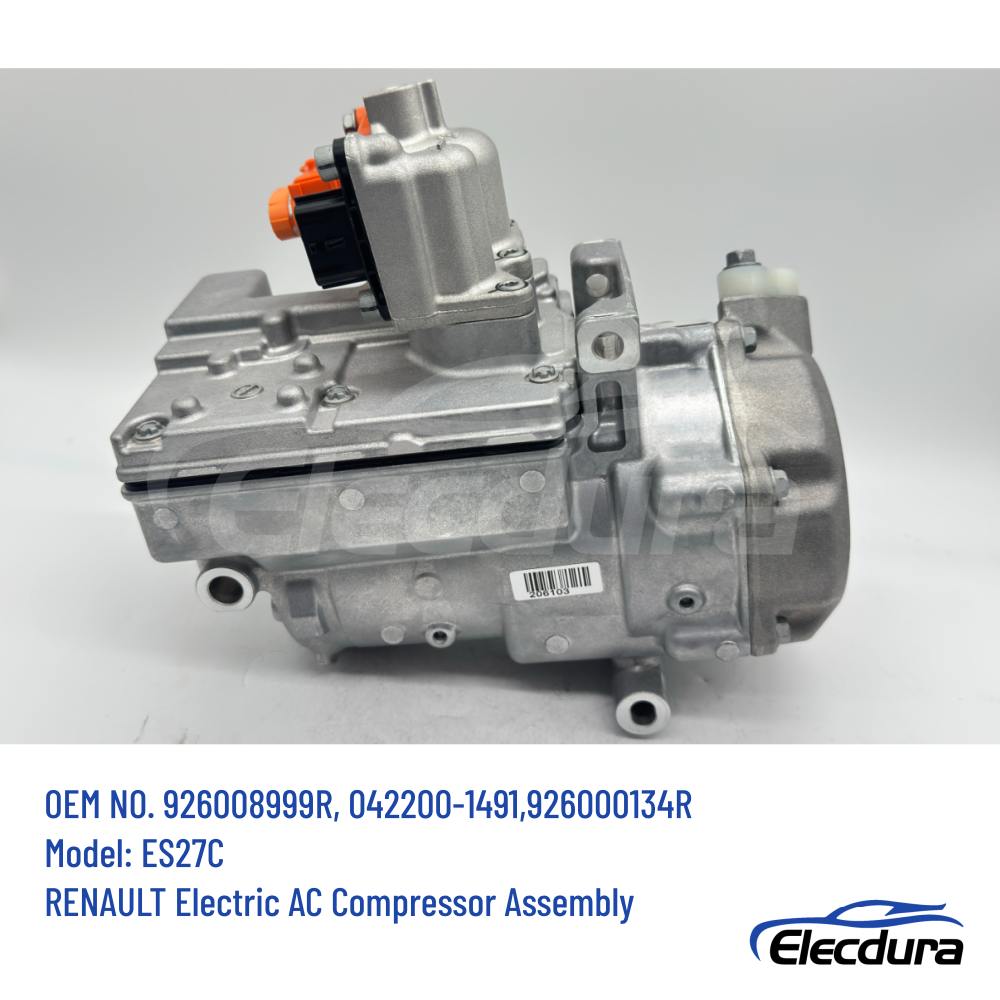 The ES27C electric A/C compressor is a high-voltage replacement unit developed for Renault electric vehicle HVAC systems. It corresponds to OE references 926008999R, 042200-1491, and 926000134R and is used in Renault Fluence EV, Kangoo Express EV, and ZOE models from 2012 onward.
